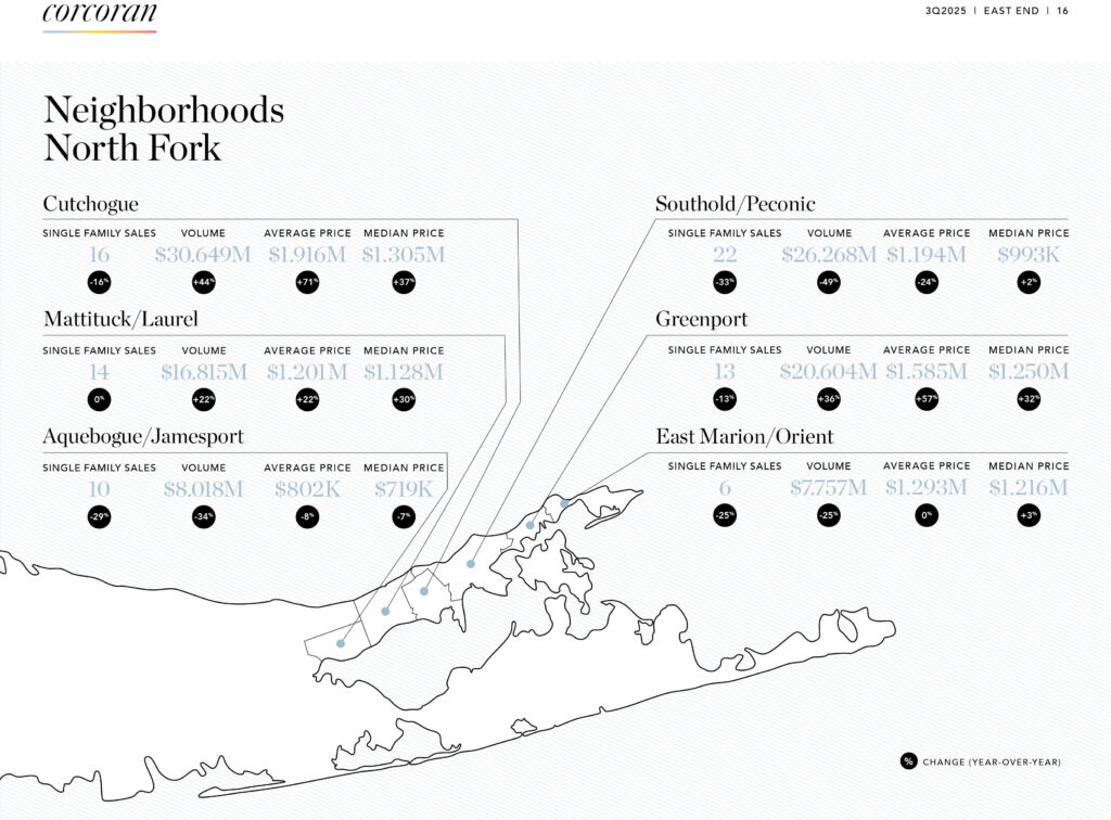 The Corcoran Group’s quarterly East End Market Report showed 81 single-family home closings on the North Fork from July through September, down from 103 in the same period last year. But the median price jumped 18% — the largest annual gain since spring 2021.