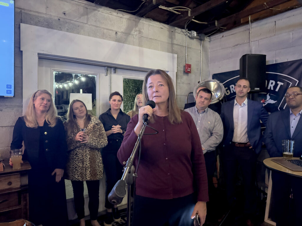 “My inbox is open, not just for the people who voted for me,” Ms. Gillooly said at the Democratic watch party at Greenport Harbor Brewing Co. in Peconic.