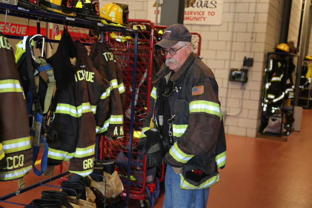 During the tour, longtime volunteer John Hinton stopped by with his wife and grandson and demonstrated how firefighters suit up in turnout gear.