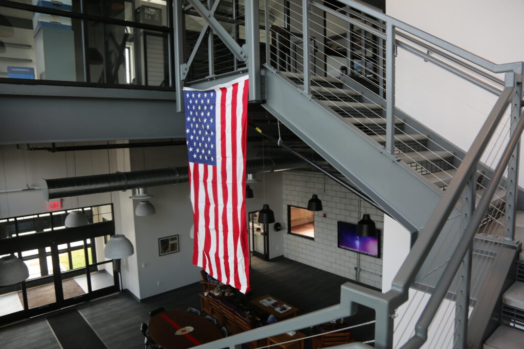 A large American flag hangs in the atrium of the building, which was designed with both present needs and future demands in mind.